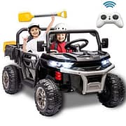 Whether cruising the backyard or tackling off-road terrain, this rugged ride-on truck is equipped with durable EVA tires, bright LED headlights, built-in Bluetooth music, and a parental remote control for safety. With a sleek black finish and roomy 2-seat capacity, it’s the perfect choice for siblings or friends.